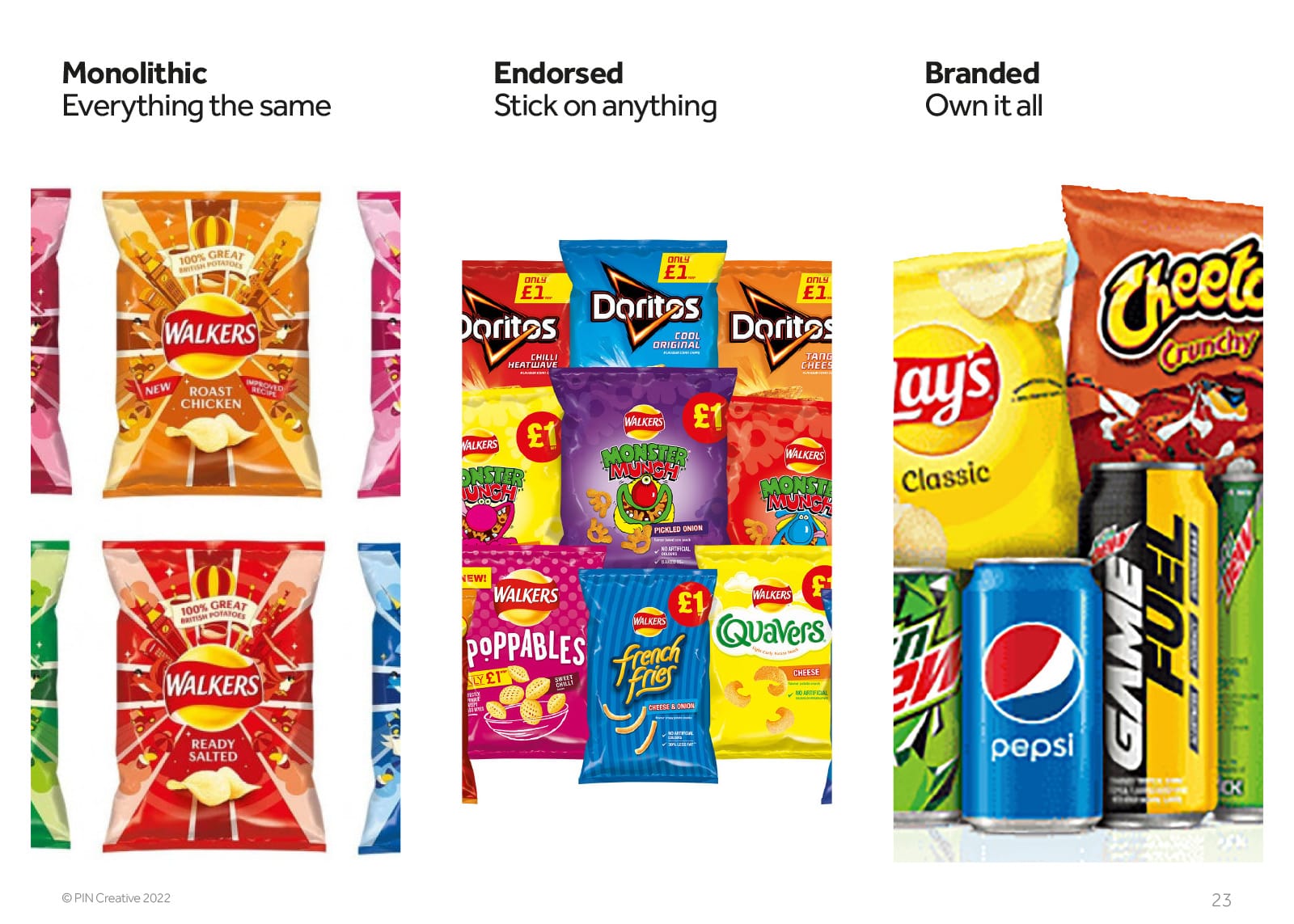 If you’re selling one product with a few variations, you’re probably Walker’s. One brand, different flavours, easy to recognise and manage. That’s monolithic. Simple to execute, but harder to differentiate.